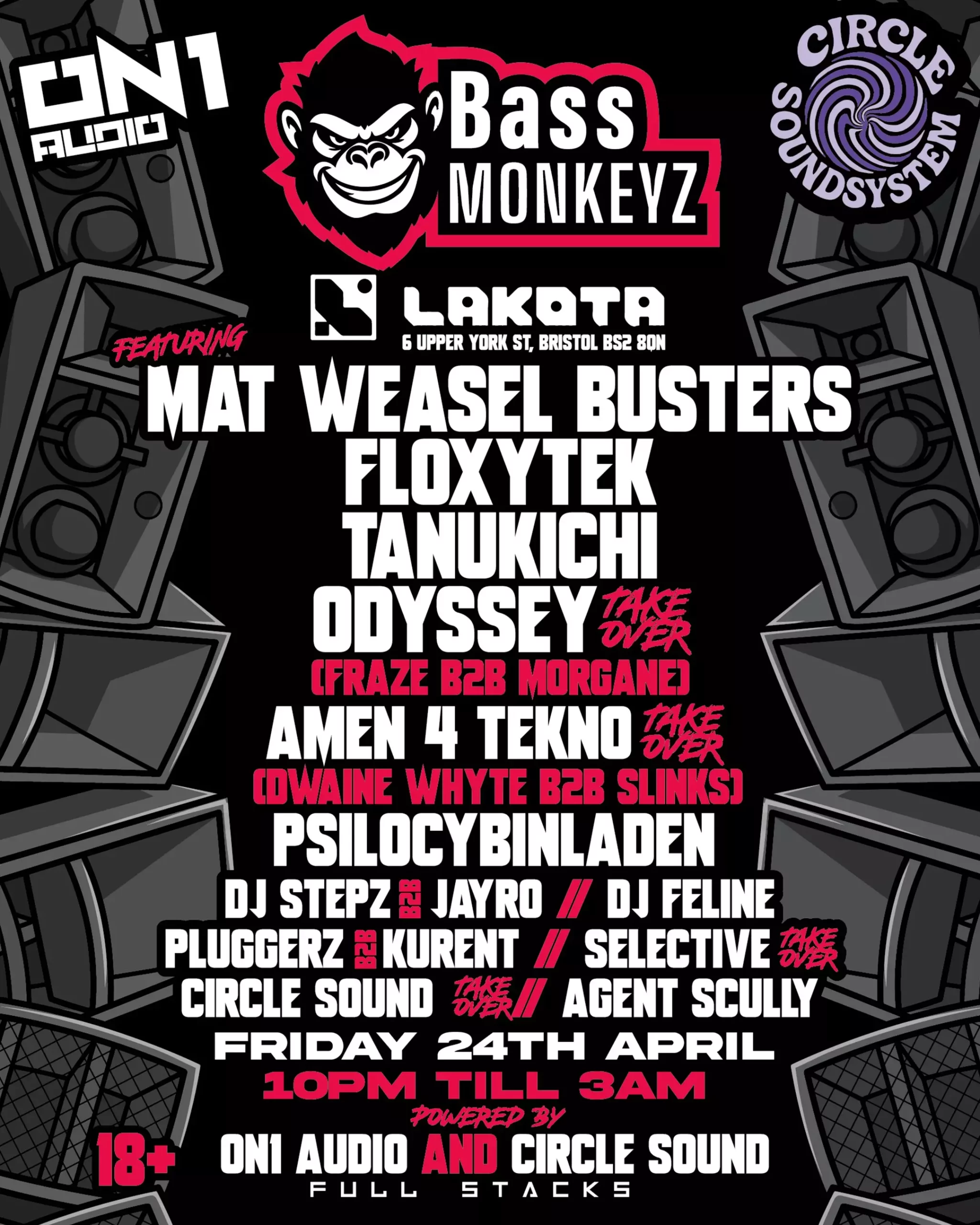 Bass Monkeyz x ON1 Audio take over Lakota with a full stack, heavy bass and serious pressure!! Featuring the legendary Mat Weasel Busters, Floxytek, Tanukichi & many more.