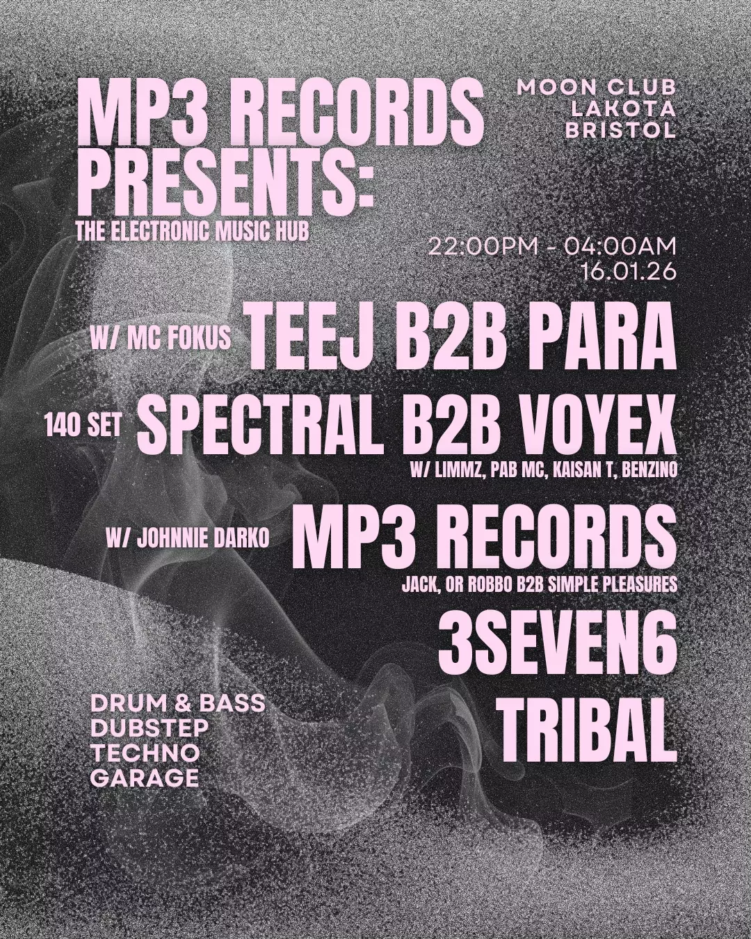On January 16th, we return to Bristol for our biggest event yet. With a stacked lineup across all bass genres, MP3 Records takes over Lakota Moon Club.
