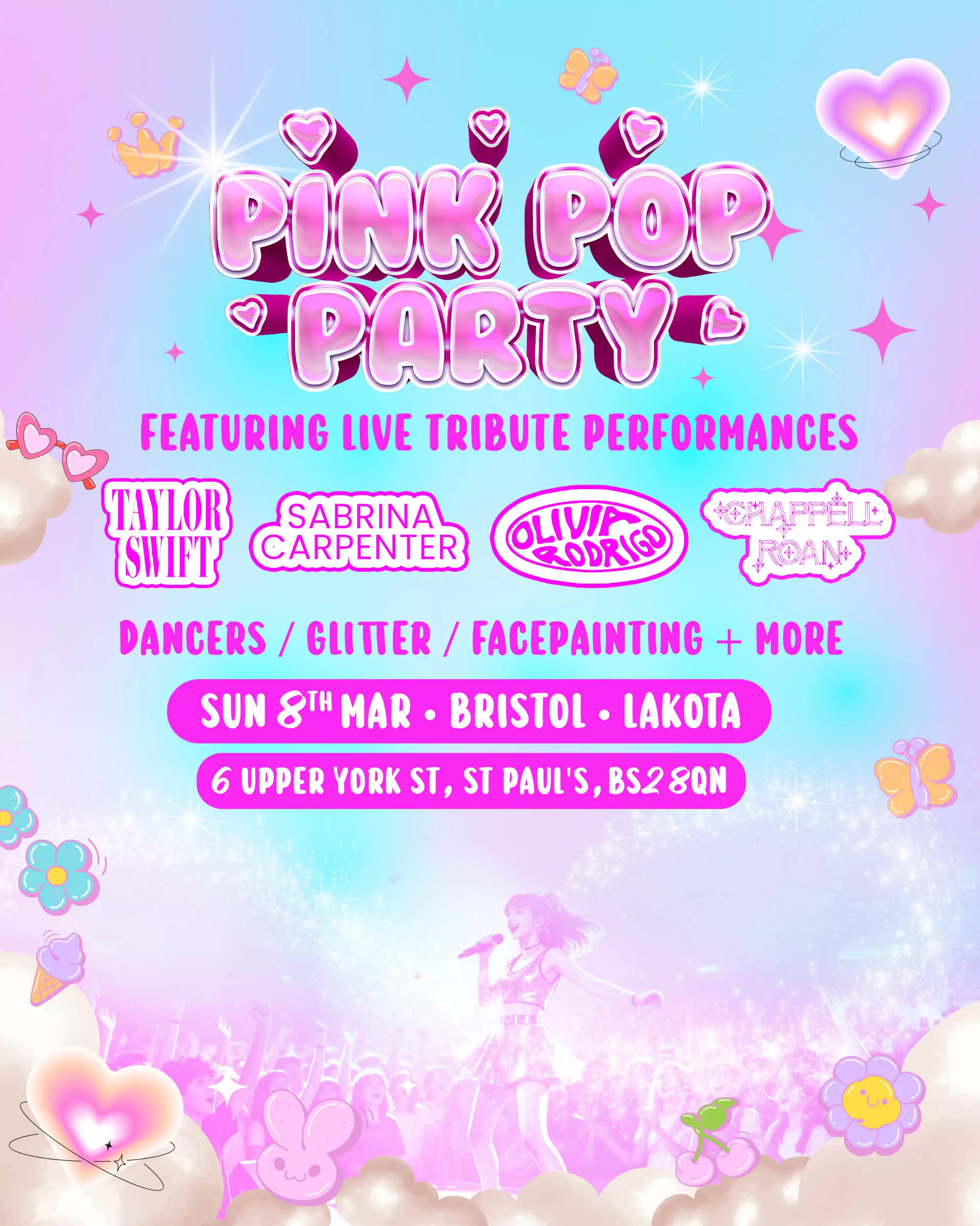 Expect the BIGGEST tributes to Taylor Swift, Sabrina Carpenter, Olivia Rodrigo & Chappell Roan! Live performances with dancers, glitter stations, stalls & more.